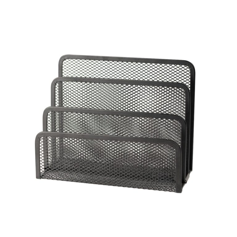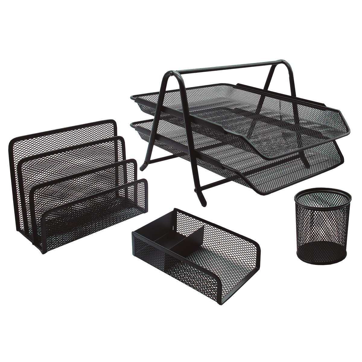 • Incluye: "• Charola malla metálica de 3 niveles • Porta lápices • Porta clips/notas • Organizador de documentos"