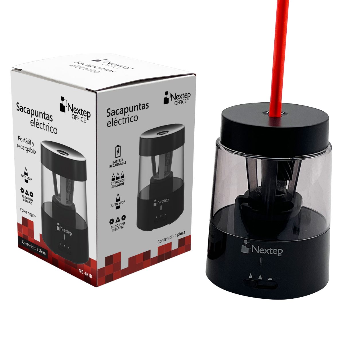 • Diseño: "· Tamaño práctico y portátil, depósito para virutas · Se detiene automáticamente · Apto para lápices con diámetro 6-8mm · Afila puntas en 3 seg."