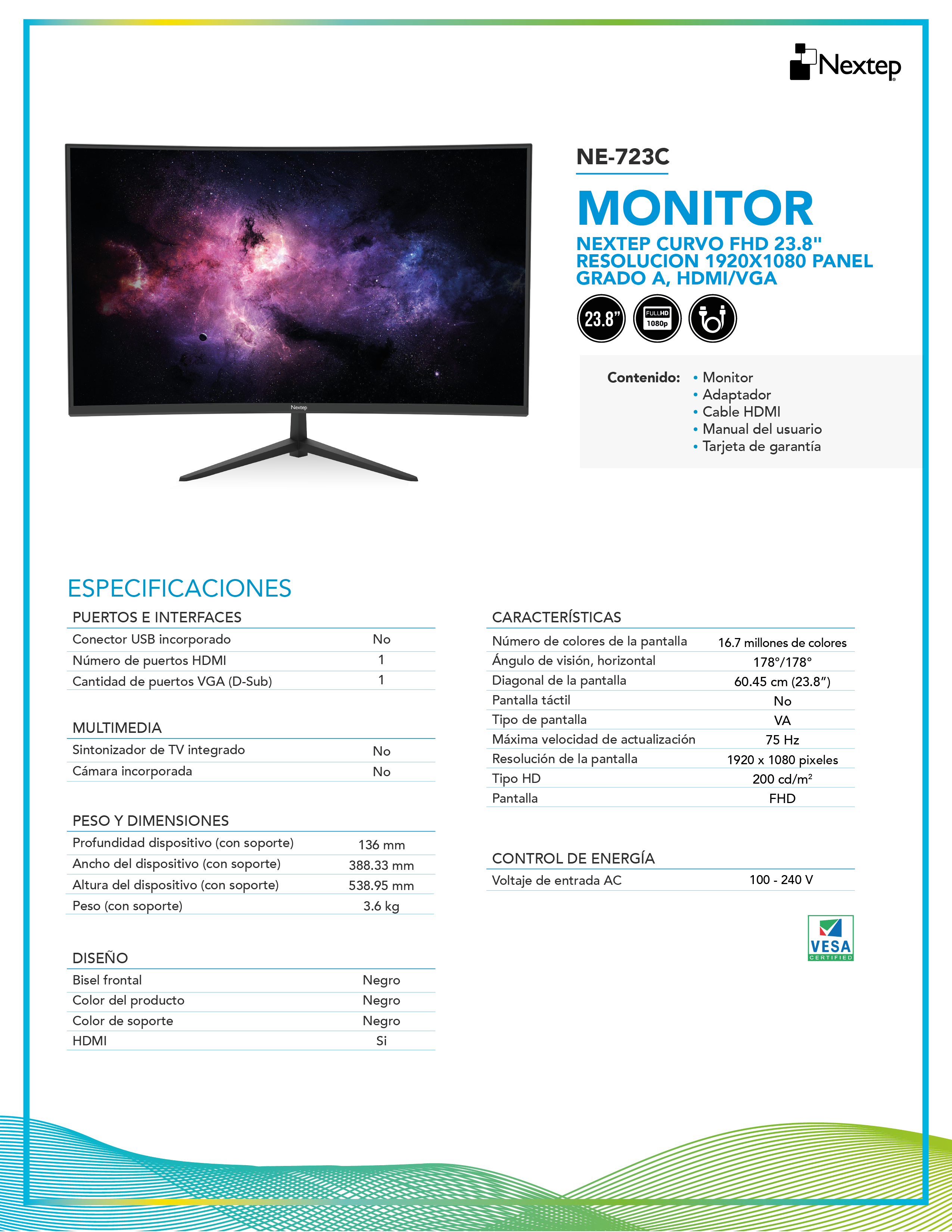 ESPECIFICACIONES: NEXTEP CURVO FHD 23.8" RESOLUCIÓN 1920x1080 PANEL GRADO A, HDMI/VGA